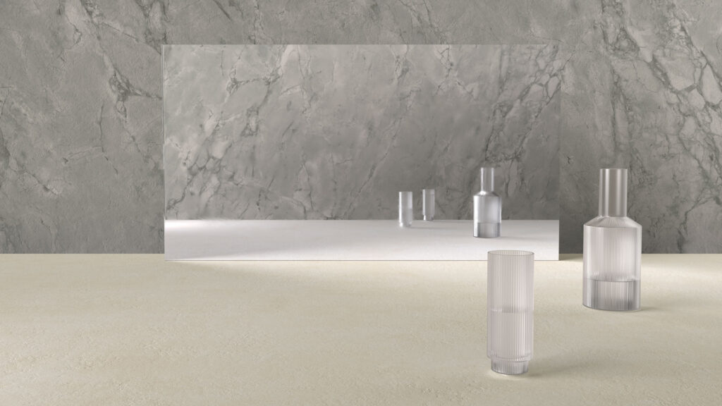 A creamy-beige backdrop that balances the textural presence of weathered stones, building up the surfaces in tender layers to create a natural and neutral-toned warm concrete, in Ultra Rough finish.