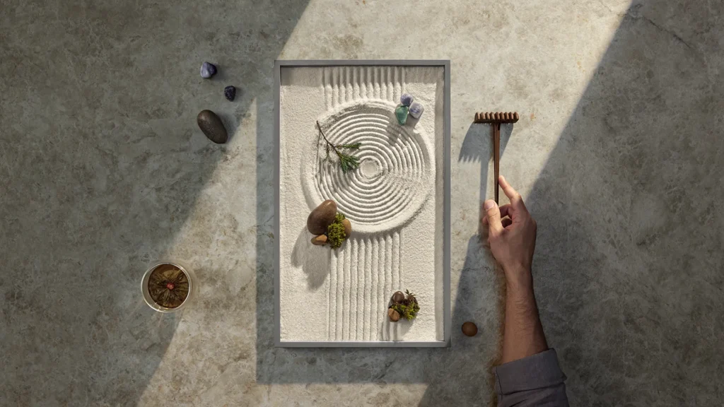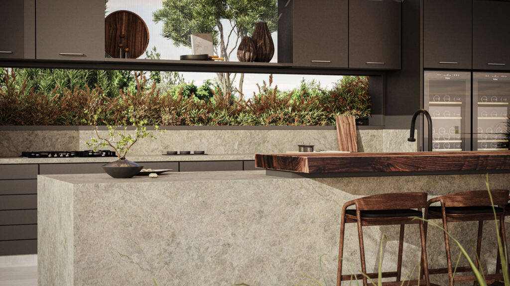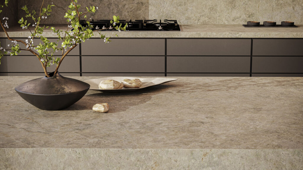 A milky base mottled with muted sage and darker mossy infusions, capturing the movement of time over natural stone. Lighter areas are animated with lively large aggregates, iodized impurities, and rust veins that add warmth and depth to this uplifting surface, in a Stone finish.