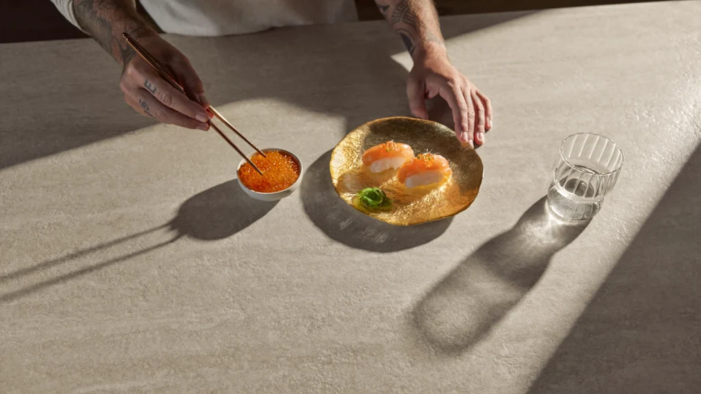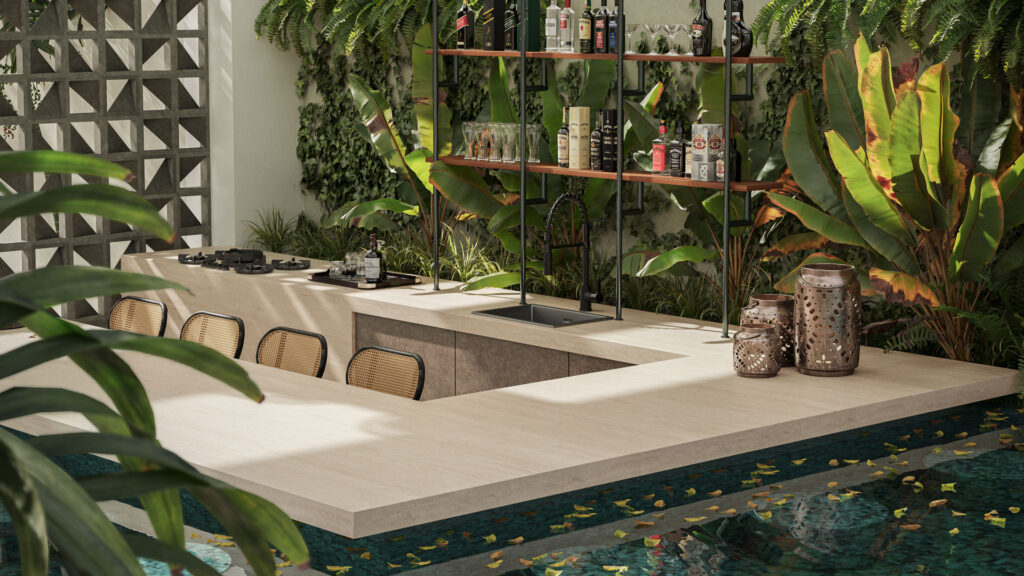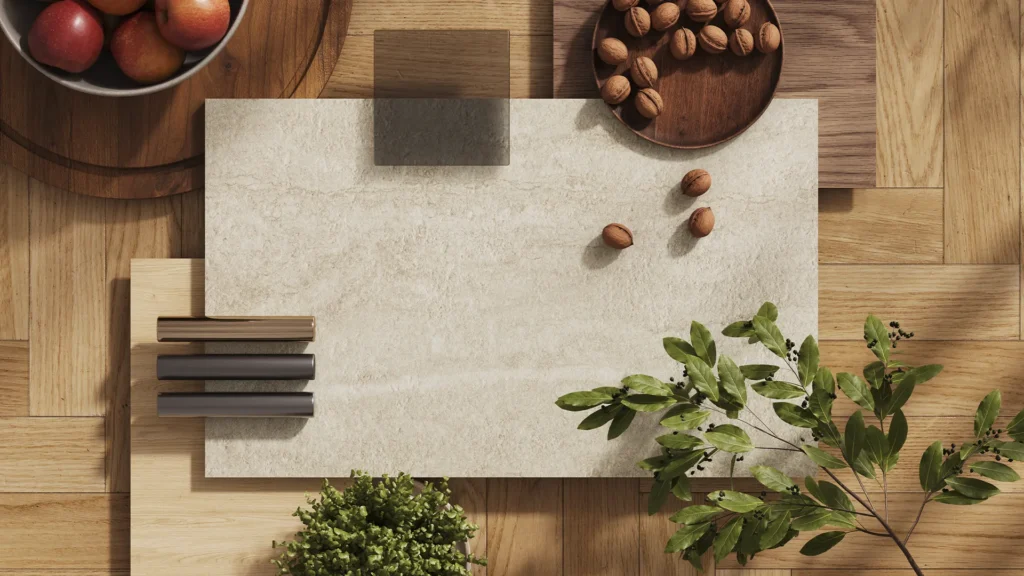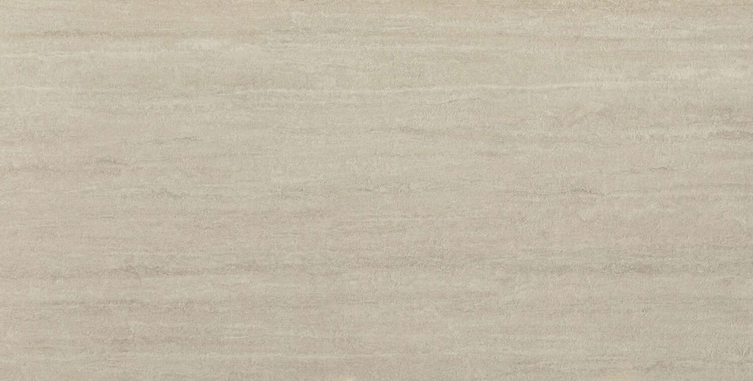 Misty clays create a two-toned earthy base banded with silver greys, creating the dense linear appearance of ancient travertine, enhanced by tiny oxidized puddles. Metallic accents, layers of fine alloy stratum, and creamy streaks blend into the neutral palette, giving it an airy appearance, in a Stone finish.
